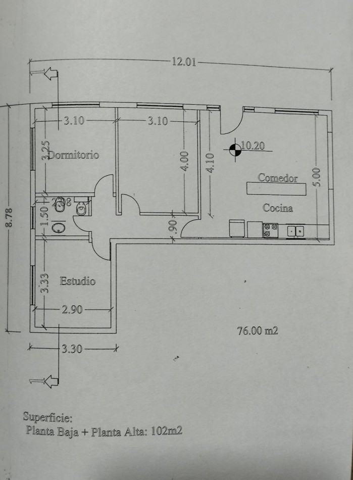 En planta baja posee una casa de 3 dormitorios, 1 baño completo, cocina con living comedor integrados de 76m2