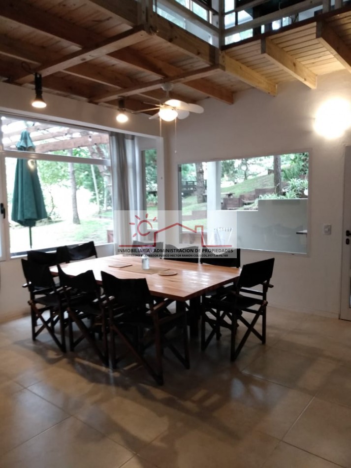 En planta baja cuenta con dos dormitorios, baño completo, amplia cocina con isla integrada al comedor y sector de parrilla. En planta alta dispone de tres dormitorios matrimoniales en suite y un luminoso living vidriado en madera con vista al parque.