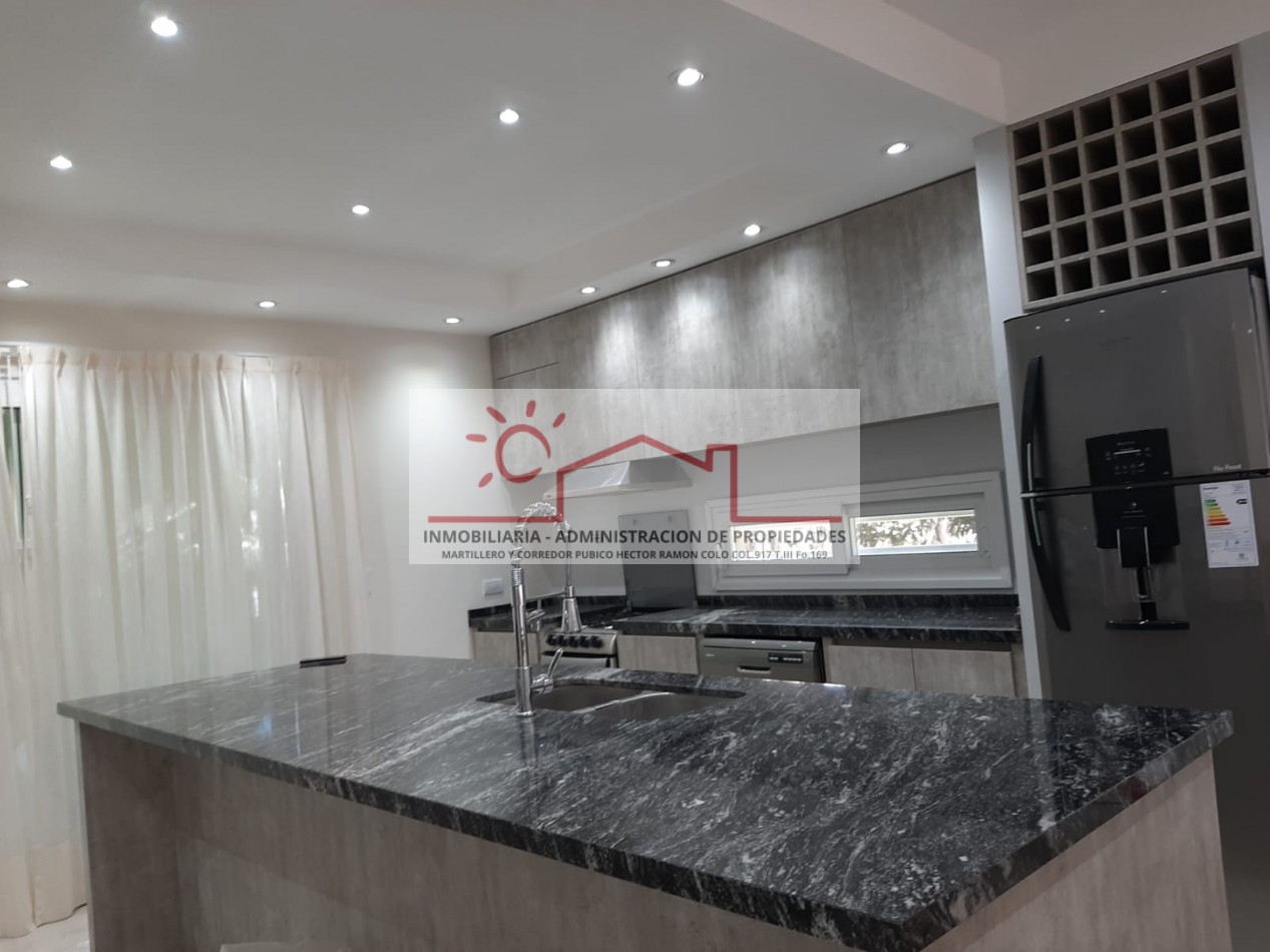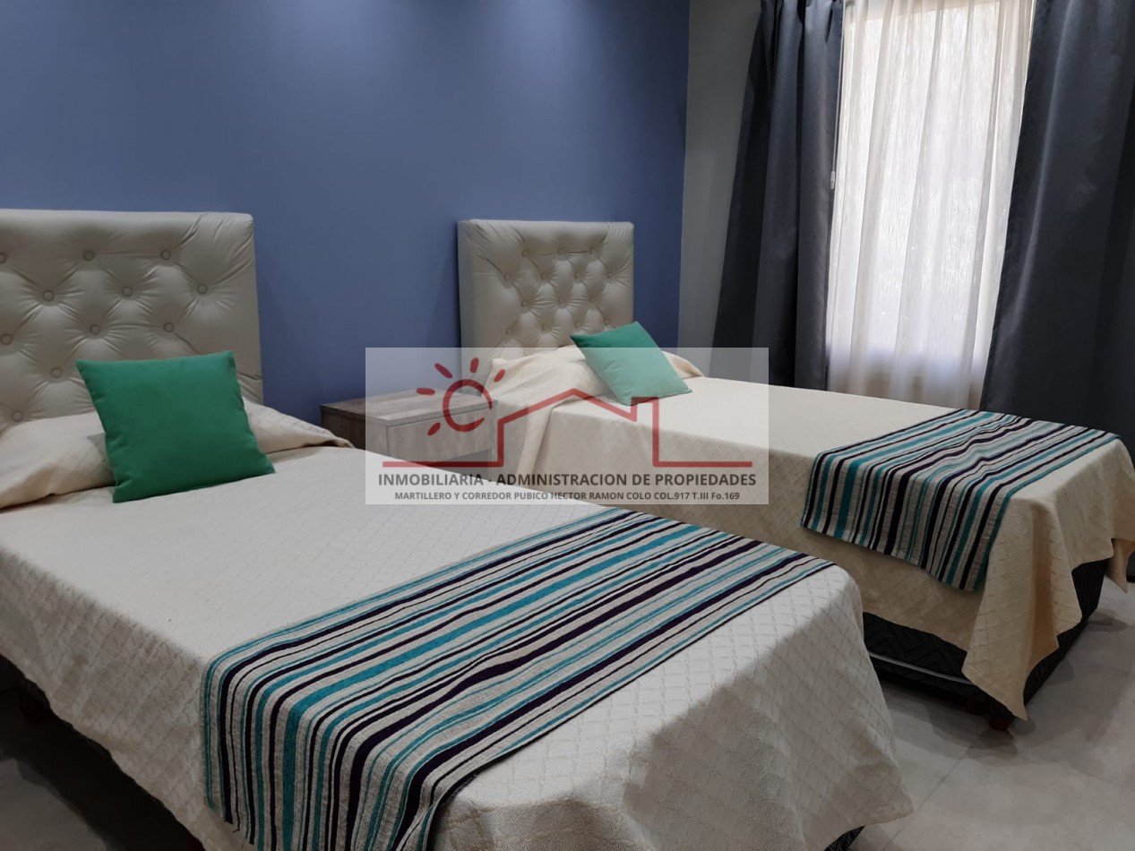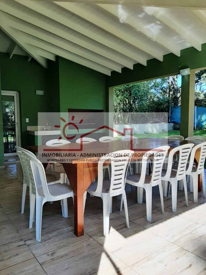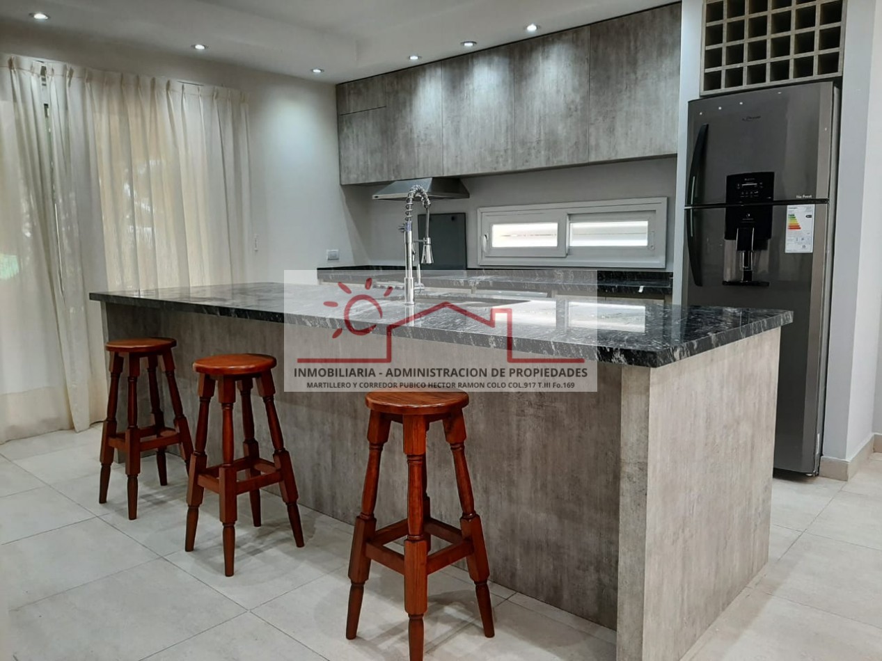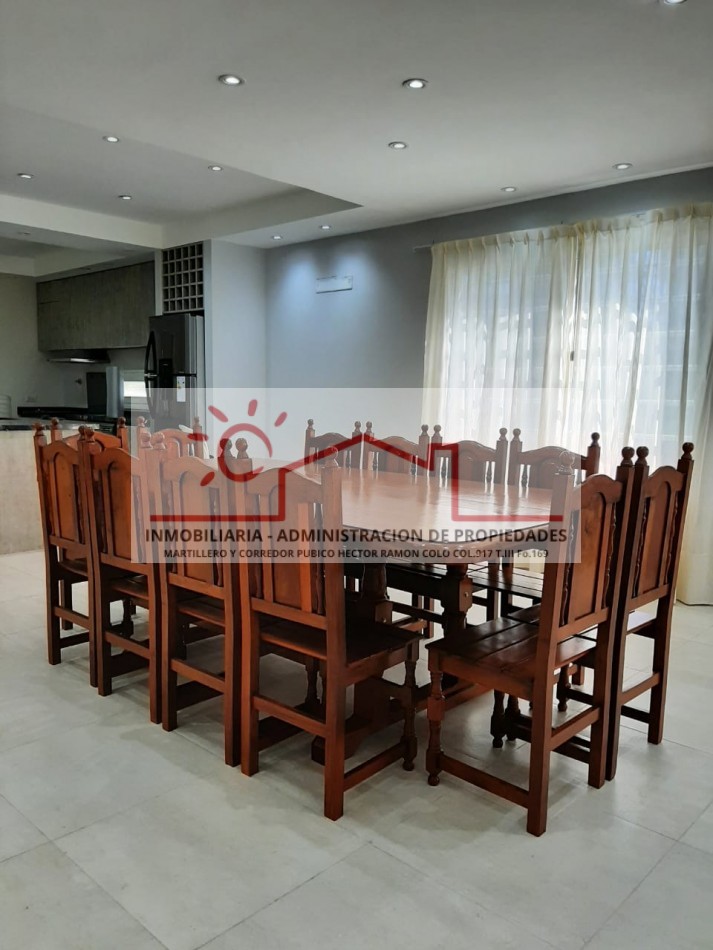 En planta alta dispone de 4 dormitorios (1 matrimonial y 3 con dos camas cada uno). La propiedad ofrece cochera, sistema de alarma y gas natural, combinando comodidad y seguridad durante toda la estadía.