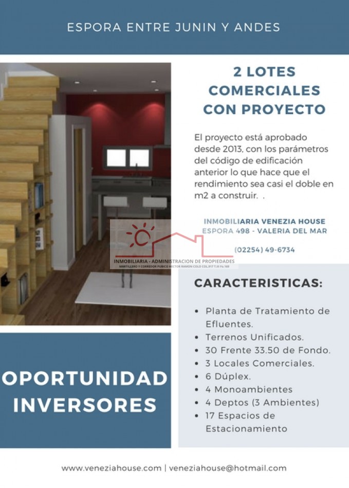 2 lotes multifamiliares unificados sobre Avenida Espora entre Andes y Junin. Ambos terrenos suman un total de 1005m2 (30 metros de frente por 33,5 de fondo), cuenta con planos aprobados para un proyecto de 3 locales en planta baja y 6 departamentos en planta alta, todos con balcón y sector de parrilla. En el predio hay espacio para realizar un estacionamiento para 17 coches.,