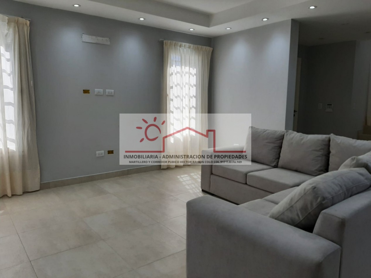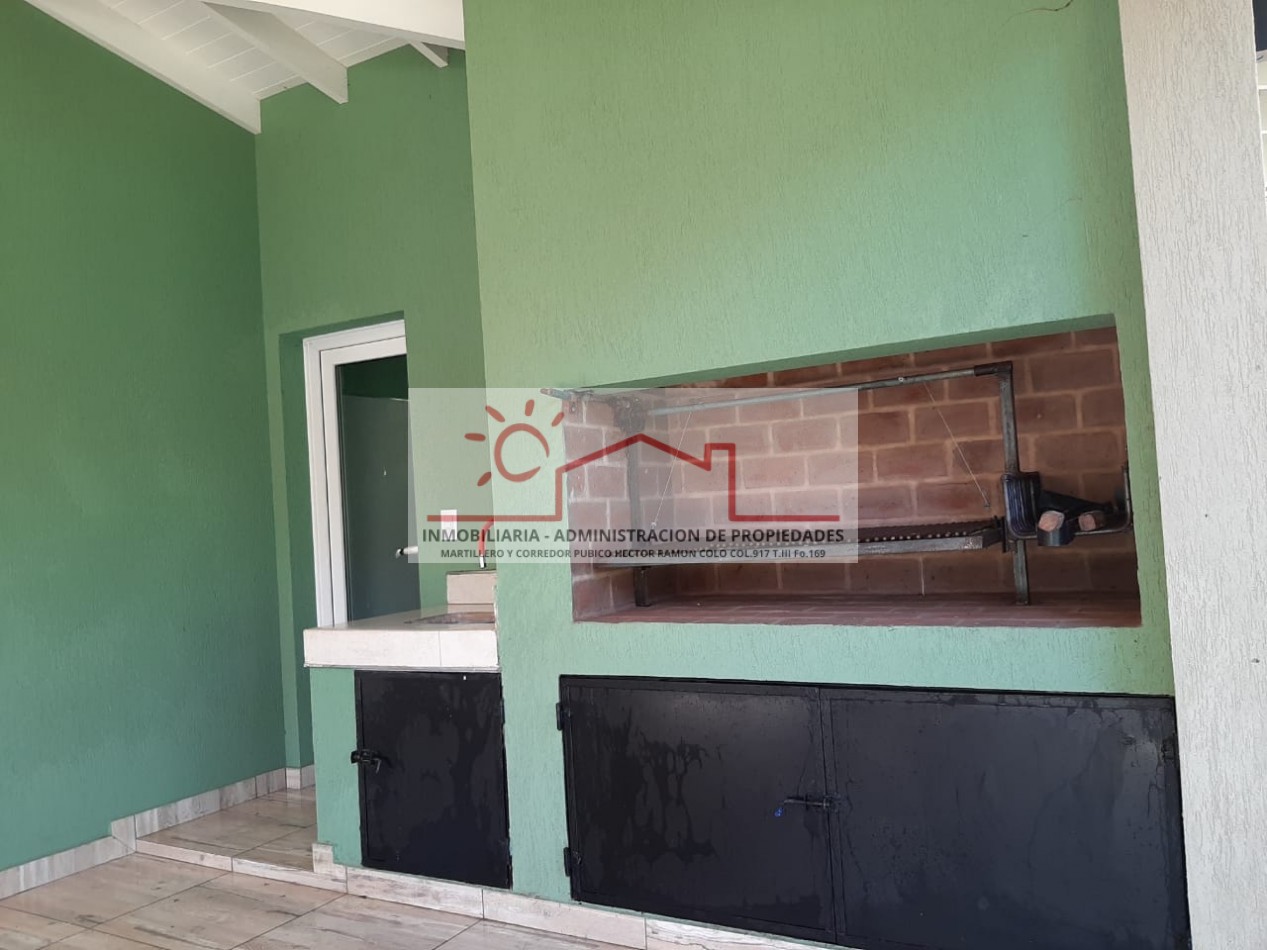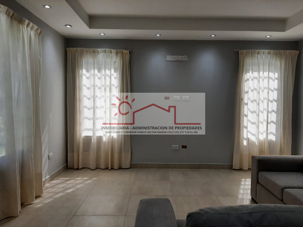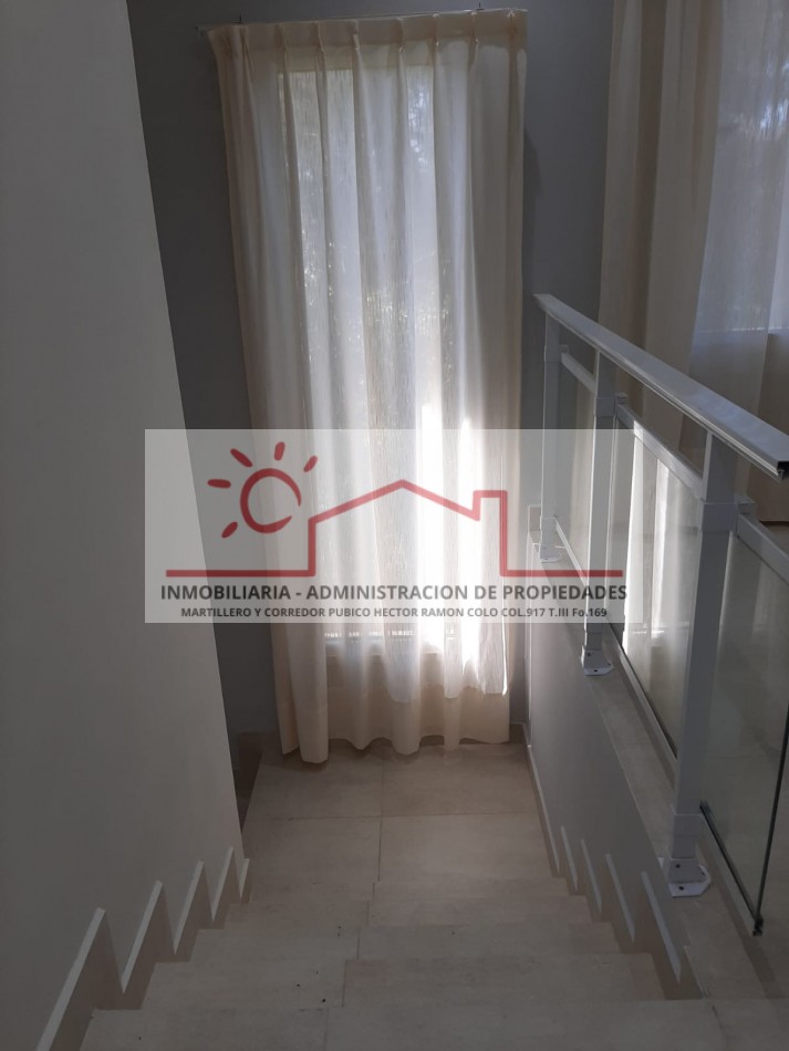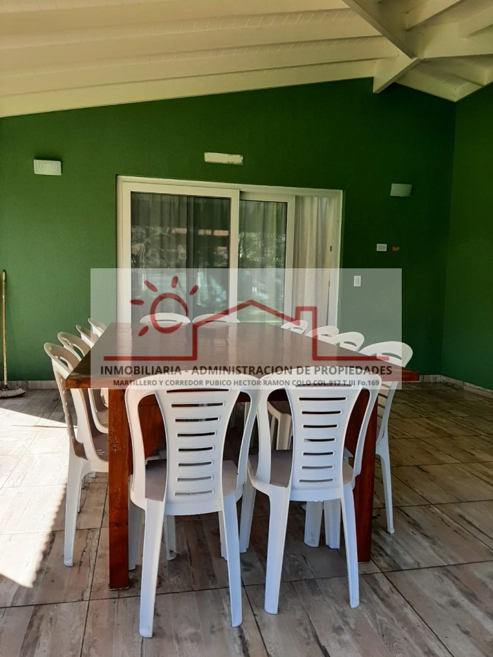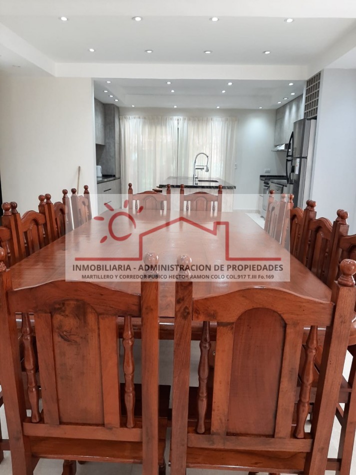 En planta alta dispone de 4 dormitorios (1 matrimonial y 3 con dos camas cada uno). La propiedad ofrece cochera, sistema de alarma y gas natural, combinando comodidad y seguridad durante toda la estadía.