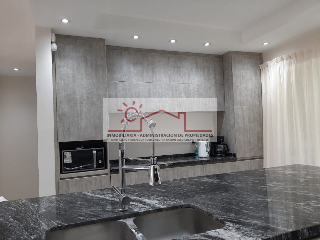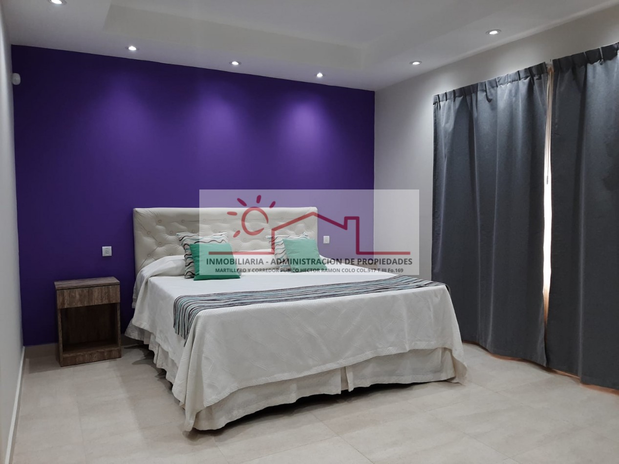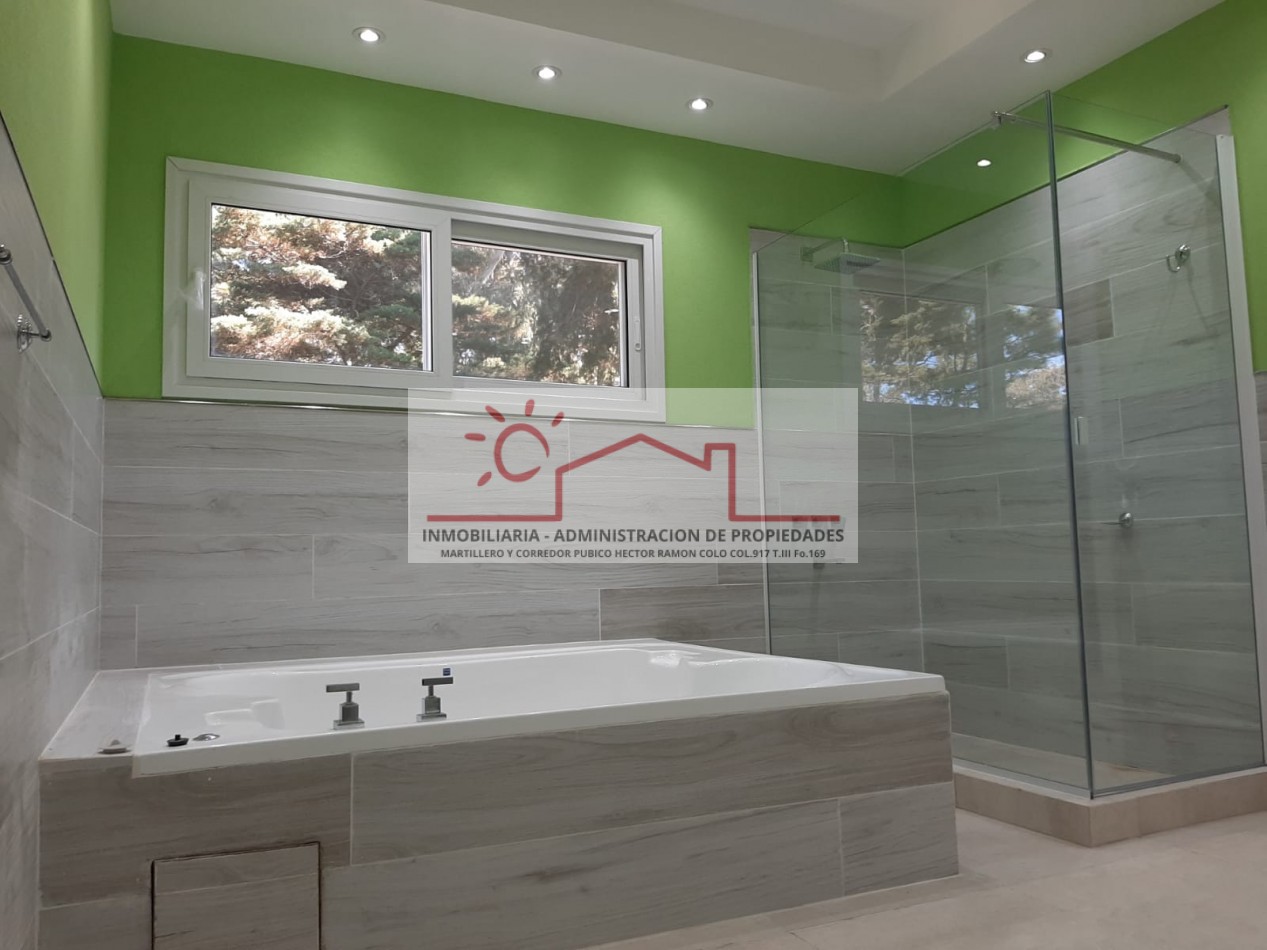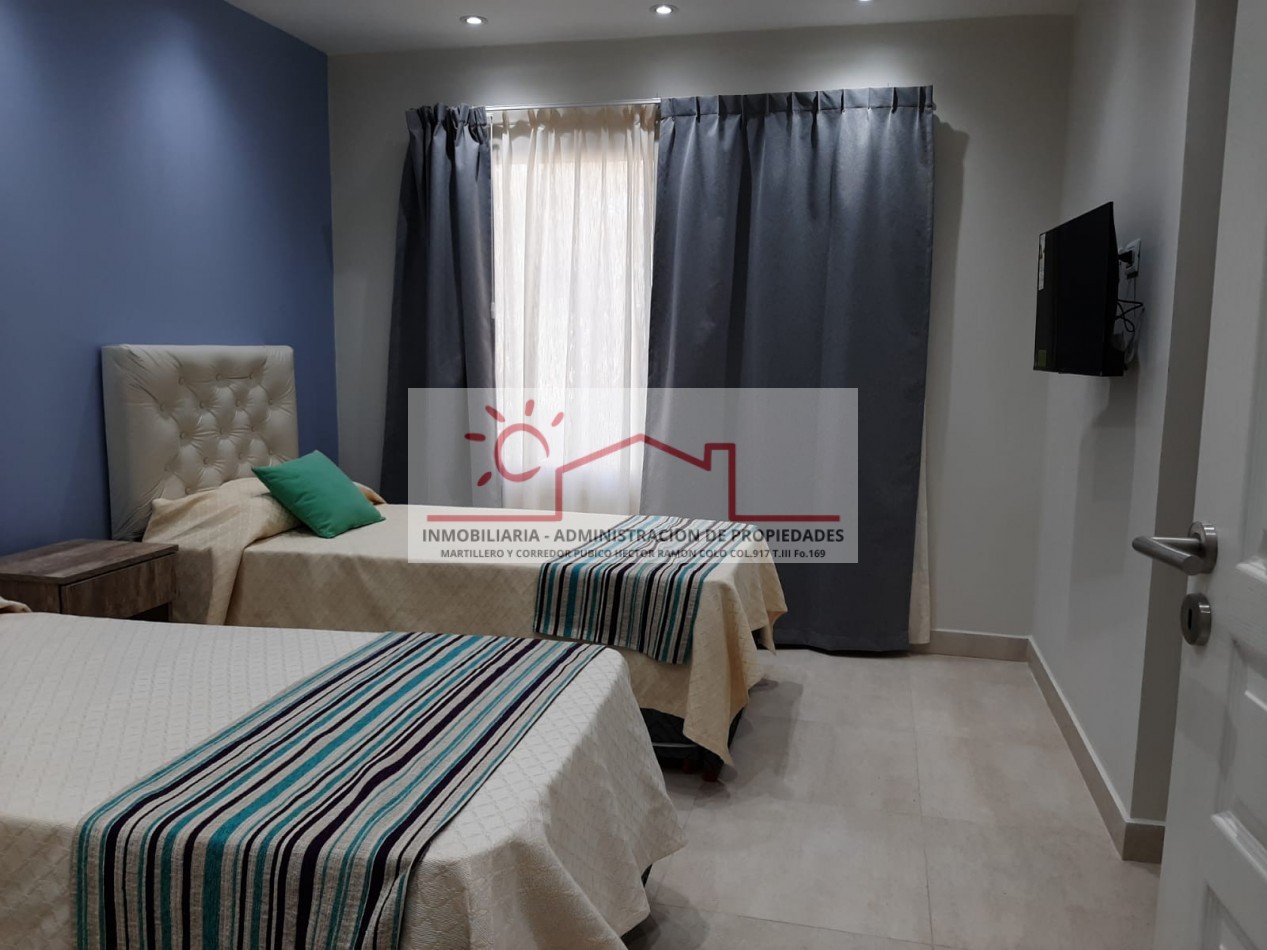 En planta alta dispone de 4 dormitorios (1 matrimonial y 3 con dos camas cada uno). La propiedad ofrece cochera, sistema de alarma y gas natural, combinando comodidad y seguridad durante toda la estadía.